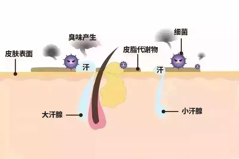 答:人体的汗腺分为两种,一种小汗腺大概占9成,排汗较稀,一般是没有味道的。另一种大汗腺(又称顶浆腺),只集中分布在腋下、胯下、乳晕、外耳道里,排出的汗里还含各种蛋白质和脂肪酸,这才与腋臭相关。不过,大汗腺分泌物本身是没有味道的,是分泌物被体表的细菌分解以后,生成各种不饱和脂肪酸,才有了异味。